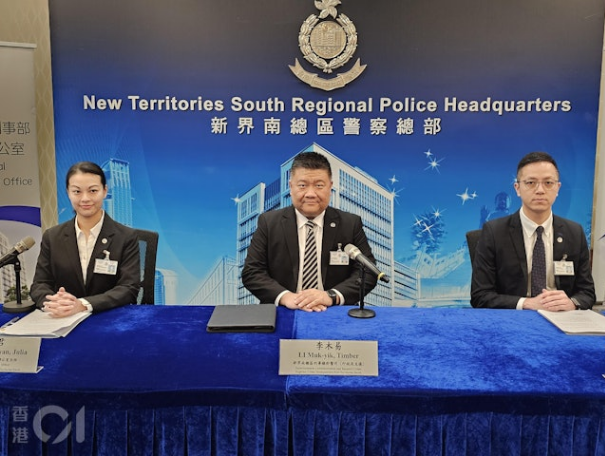 新界南總區刑事總部警司 李木易、新界南總區反三合會行動組總督察 劉煜華、新界南總區防止罪案辦公室主任總督察 陳詠君交代案情。(梁偉權攝)