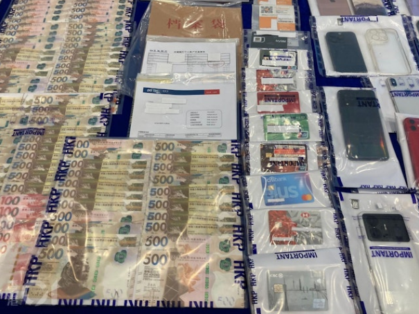 行動中,警方檢獲大量銀行文件、現金、銀行卡及手機等。(曹德熙攝)